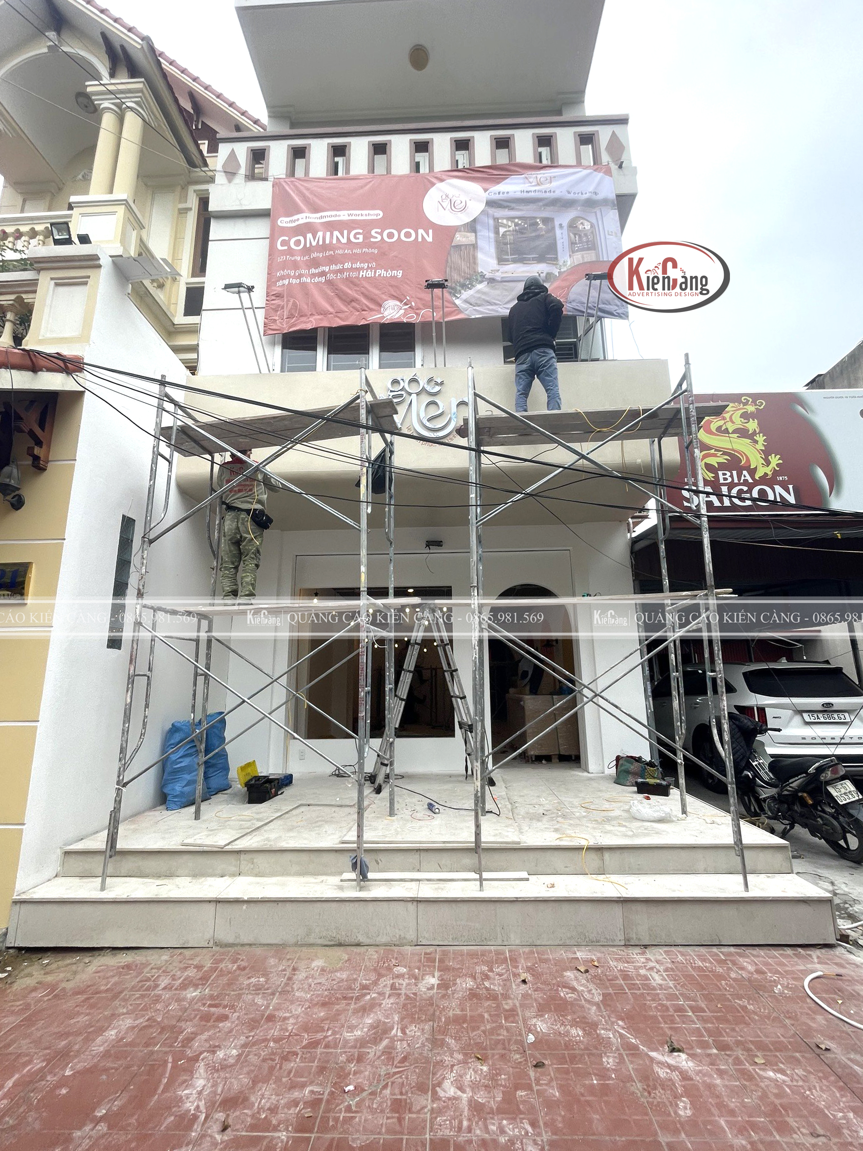 Hình ảnh biển hiệu cà phê Góc Mer sau khi hoàn thiện vào ban ngày